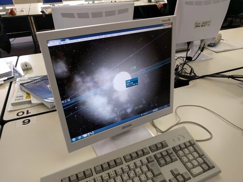 天体の単元の導入。おなじみフリーソフト「Mitaka」を共有フォルダに入れ、パソコン室にて1人1台のPCにて個人で操作。これまでプロジェクターを使って提示するだけだったが、個人で触れられた方が生徒にとっては断然面白い。地球・月・太陽の大きさや位…